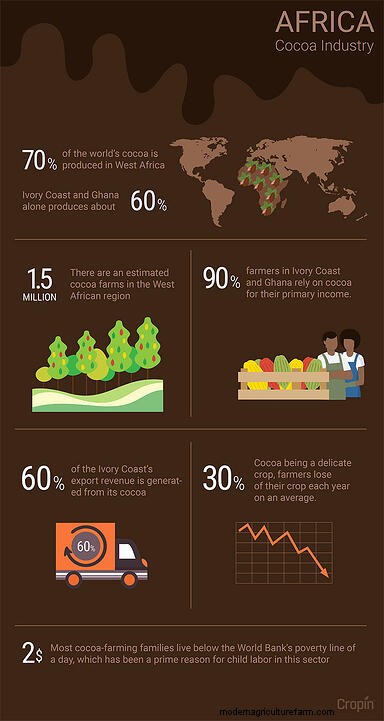 The cocoa industry is also quite notorious for the use and exploitation of children in cocoa production, particularly in the African region. Cocoa Barometer 2018, a comprehensive report on the current sustainability developments and highlights critical issues in the cocoa sector by a global network of cocoa-based NGOs and Trade Unions states that there are nearly 2.1 million under-age minors employed by cocoa plantations in the Ivory Coast and Ghana alone.