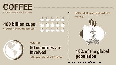 As one of the most-traded food and beverage commodities in the world by volume, coffee is a popular choice of beverage for millions of people, resulting in the consumption of close to 400 billion cups each year. More than 50 countries are involved in the production of coffee beans, and estimates show that the coffee industry provides a livelihood to nearly 10% of the global population, or up to 800 million people, at different levels of production and distribution.