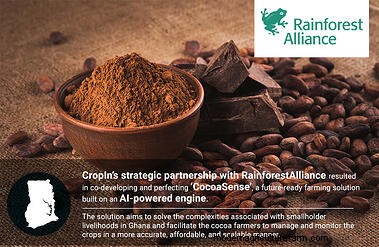 Cropin’s strategic partnership with Rainforest Alliance resulted in co-developing and perfecting ‘CocoaSense’, a future-ready farming solution built on an AI-powered engine. The solution aims to solve the complexities associated with smallholder livelihoods in Ghana and facilitate the cocoa farmers to manage and monitor the crops in a more accurate, affordable, and scalable manner.