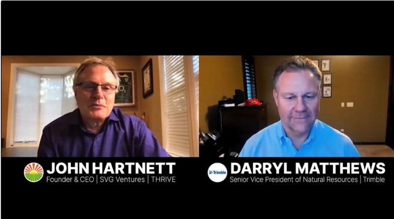 Last week, Trimble Natural Resources senior VP Darryl Matthews sat down with John Hartnett, founder and CEO of THRIVE Ventures as part of the THRIVE-SVG Ventures series: Spotlight on Canadian AgriFood Innovation. The two discussed the future of farming in Canada and Matthews shared his insights on the importance of innovation in the agrifood sector and how it will affect farmers in the coming years.