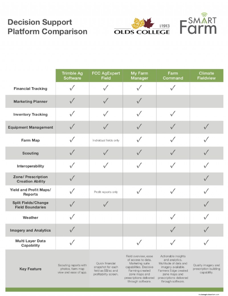 Olds College is home base for the Canadian SmartFarm Initiative, described as “a living lab for hands-on learning — it is a place for innovation, validation, demonstration and scaling of smart connected agriculture technology through industry partnerships.” As part of this ag software comparative study, the Olds College SmartFarm Team evaluated several popular software platforms on the market, including: