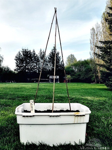 This year we are growing green beans in buckets to allow more space in or raised beds for other crops. We simply drilled drainage holes in the bottom of a large storage container and used bamboo sticks to create a teepee in the middle for the beans to climb.