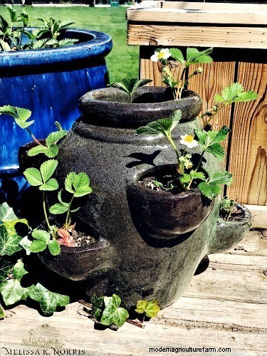 Another choice is glazed clay pots. We grow our strawberries in a glazed clay strawberry planter and find that it offers the perfect balance between keeping moisture in and allowing it to drain out. The downside to these glazed clay pots is that they tend to be fairly expensive.