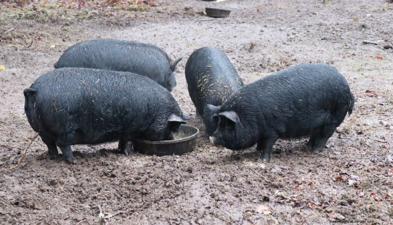Our American Guinea Hogs are very sweet animals. They're extremely good-natured and docile. A few years back we raised Hereford pigs. The difference between the two breeds is that Herefords tend to get a bit larger and can tend to be very aggressive at feeding time. So once they're fully grown, it can become a bit dangerous depending on who's feeding them (probably not ideal for smaller children).