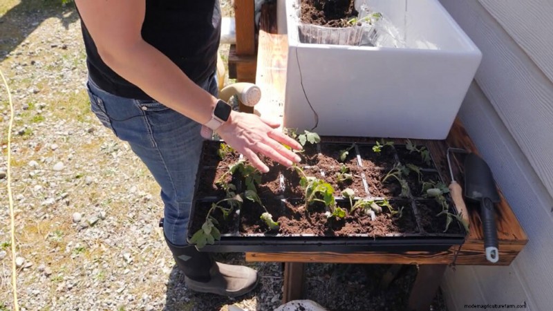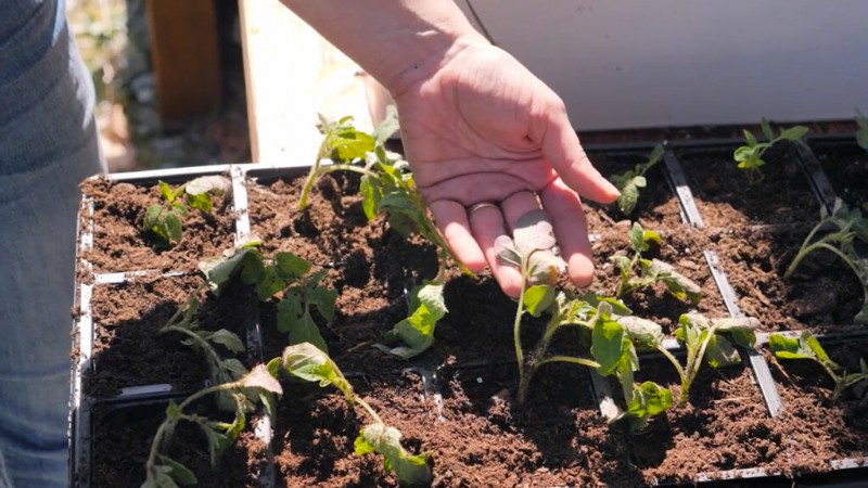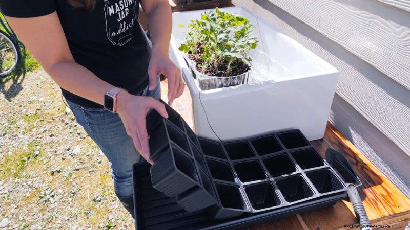 In the video above, I'm potting up my tomato seedlings, which still have at least four weeks before they can go out into the garden, so I'm using a container no smaller than 4 inches wide. (I also like to use these trays that allow for bottom watering.)