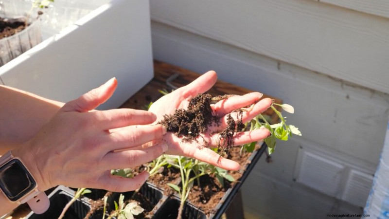 Because our plants are still small and in need of proper nutrition, I like to use potting soil not soil from the garden. This ensures I won't bring any gnat or fly eggs into my home where they'll hatch and make a mess. (This also holds true for any open bags of potting mix from the year before where bugs had access.)