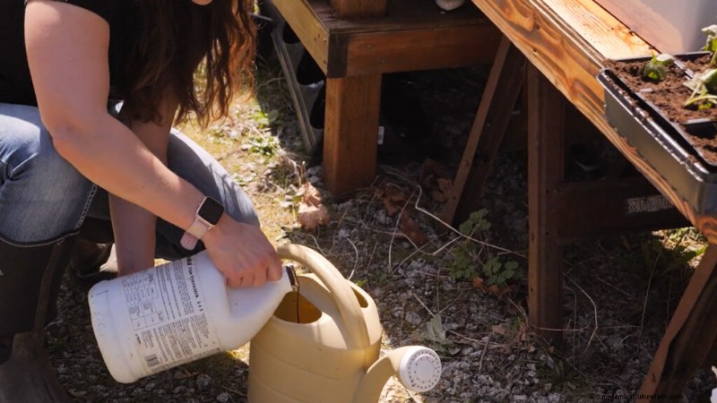After about 2-4 weeks, most plants will likely benefit from some type of fertilizer. I like to use a fish fertilizer that won't burn my plants. It's a 5-1-1 mixture, which means the ratio of “N-P-K”, or nitrogen, phosphorus, and potassium.