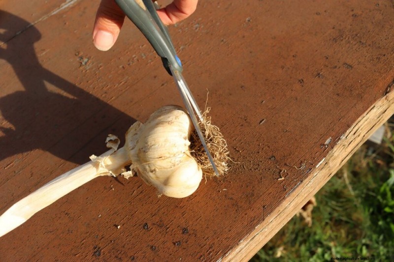 After your garlic has been cured for at least two weeks in dry weather (or four weeks in wet and humid weather), it's time to get it ready for braiding. Cut off the roots and rub as much of the leftover soil off as possible.