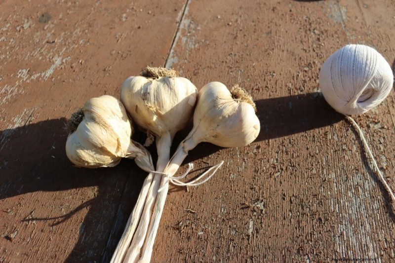 Now take three bulbs of garlic, bulb side at the top with the stems hanging down. Tie them together near the bulb. This is the start of your braid. Take a bulb and lay it on the center stem and add the stem to it. Now cross over your right side stem.