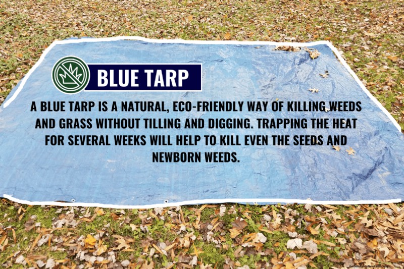 A blue tarp is a natural, eco-friendly way of killing weeds and grass without tilling and digging. Trapping the heat for several weeks will help to kill even the seeds and newborn weeds.