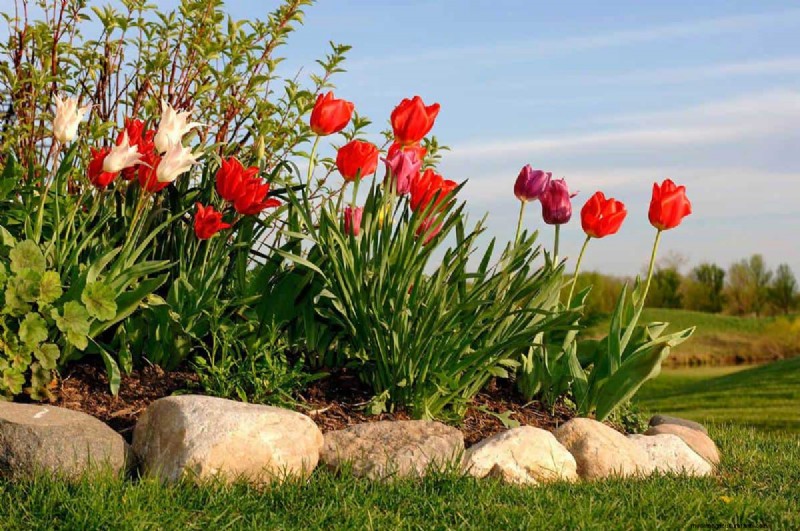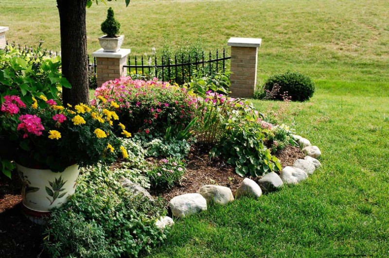 Edging your garden with large rocks adds dimension and order. Since stones are freestanding, you can easily form the shapes and figures you want with them. Make tree circles, line a walkway, line a garden bed, or edge whatever else you see fit. The rocks, like in the photo above, help separate your garden from your lawn as well as keep mulch and other garden fillers together.