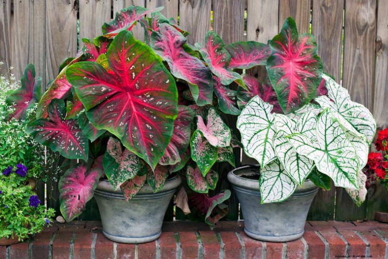 Caladium is a latin name adopted as the name of this plant. Its common nickname is the "Heart of Jesus" because of its heart-shaped leaves and red pattern inside. These plants differ from most on this list because they are best when planted in zones 9 to 11 and left fully out of the sun. They thrive in shady areas such as patios, decks, porches, etc. However, in colder climates they can be left in the sun for part of the day.
