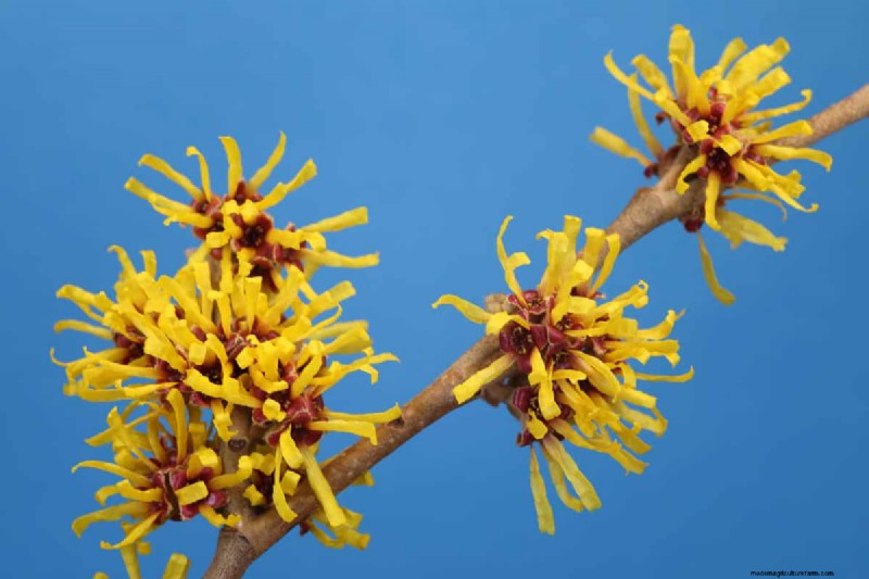 Witch Hazel (Hamamelis) is thin shrub or tree that commonly has yellow or green leaves. Its rounder leaves make for a unique look when paired with the skinny nature of the tree itself. These trees are common in North-East America in forests and wooded areas. They typically do not grow very tall, but some can reach a few feet. Common in zones 3-9, these trees only require watering. They do well in partial shade or really sunny areas.