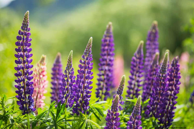 Lupines (Lupinus) are tall, cattail-shaped plants covered in little, purple flowers. They also come in other colors too, but this is more rare and harder to find. Luckily, Lupines love almost any soil and thrive in both shade and the sun, although they prefer cooler weather in zones 4 through 9.