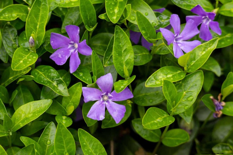 Vinca minor would be a great addition to an area where grass doesn't grow well. Honestly, purple flowers like these would do wonders for covering any problem region on a landscape.