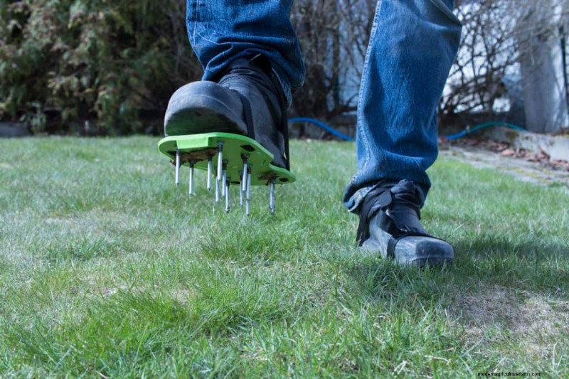 The last option is simple aeration shoes. Many advise against the aeration shoes unless you have a very compact small lawn as it takes a lot of labor and time to aerate with shoes.