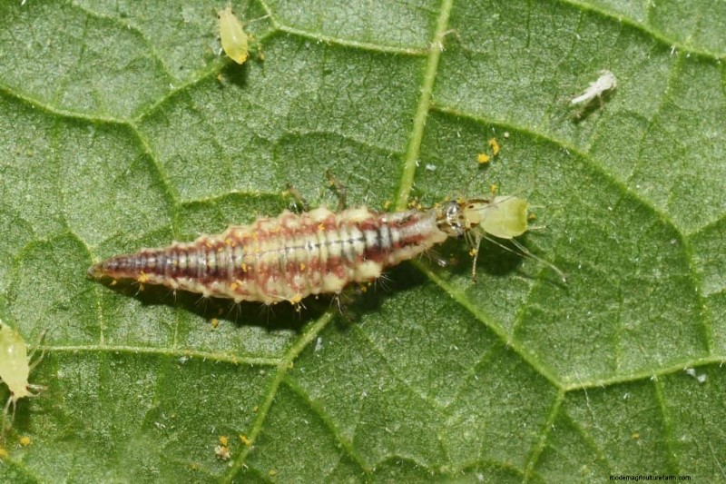 The advantage to the larvae over other predatory bugs is that they do not have wings and will stay in the garden areas until they hatch. Once they have become adults, they no longer feed on other insects. Biological control supply houses sell lacewing larvae. Planting golden marguerite, coriander, and dill in and around the garden will help to attract green lacewings.