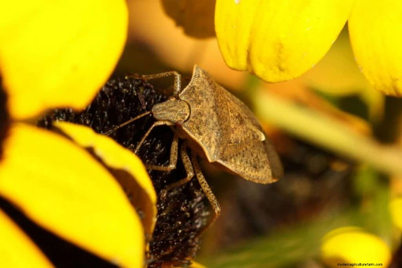 The spined soldier bug is a type of stink bug that is beneficial. It is most notable for its silvery brown, armor-like coloring with pointy horizontal corners on the top of the wings by its head. Both larvae and adult bugs will feed on mite populations.