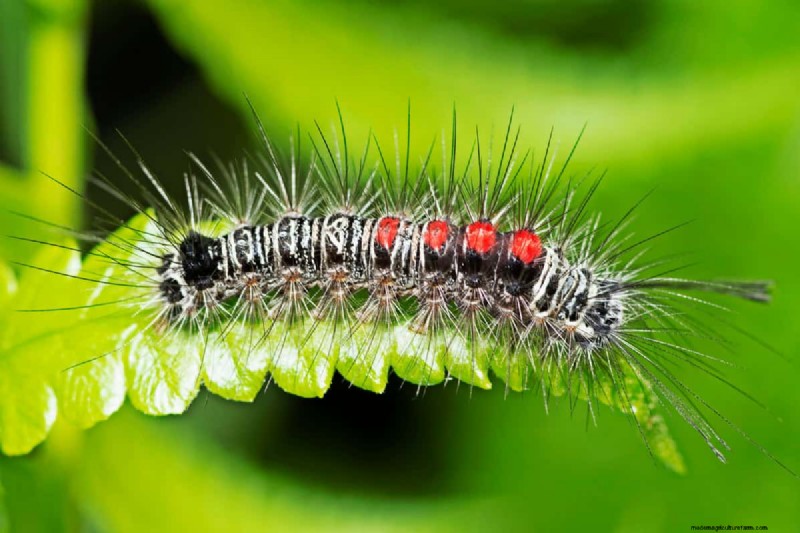 Additionally, as the larvae of the wasps' hatch, the caterpillars will appear to have rice grains attached to them.