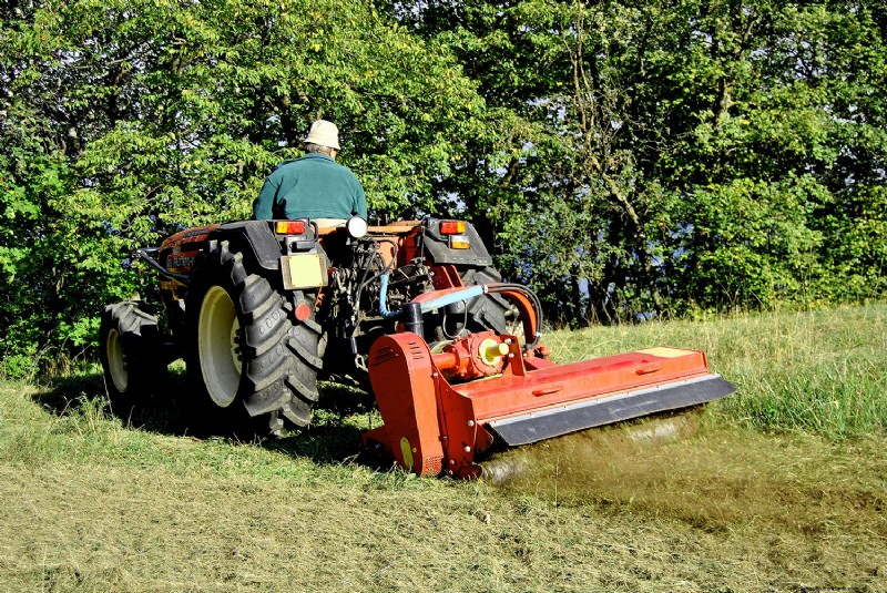 A tractor tows the brush hog machine, a heavy-duty rotary mower. It could also be referred to as a "topper" or "slasher," but these terms are location-specific and not typically heard in the US. It has blades that are built on hinges. Most people think brush hogs are similar to lawnmowers, but they are different because a lawn mower's blades are rigidly attached to the drive.