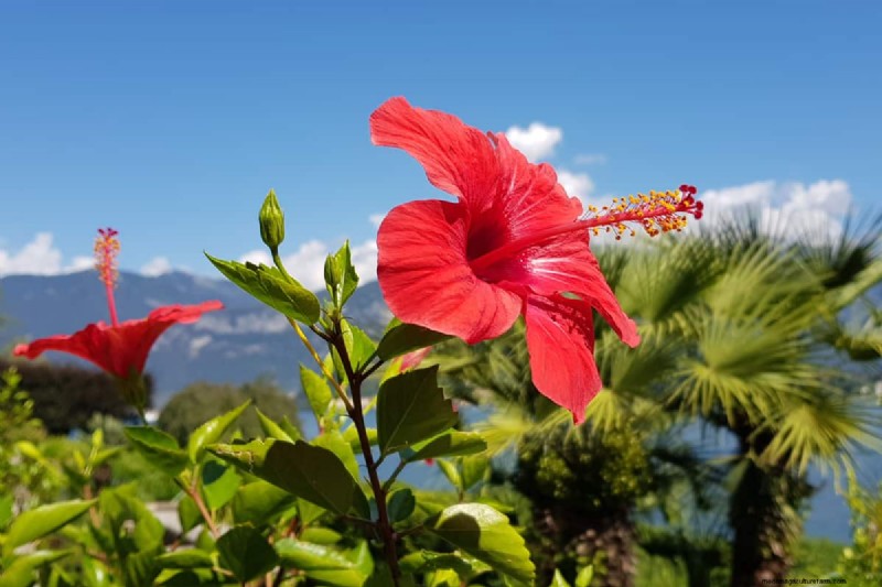 Tropical Hibiscus has glossy leaves and vibrant flowers. Its trumpet-shaped blooms have protruding stamens. The flower's size has a diameter of 3-8 inches.