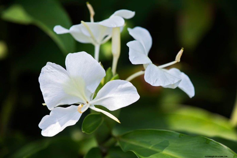 White Ginger Lily is a perennial plant known for its fragrance and butterfly-like white flowers that bloom in the late summer and early fall seasons.