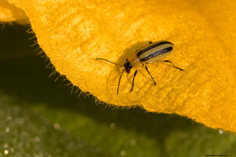 The cucumber beetle is a common insect that feeds on the leaves of the cucumber and other cucurbits like squash and melon.
