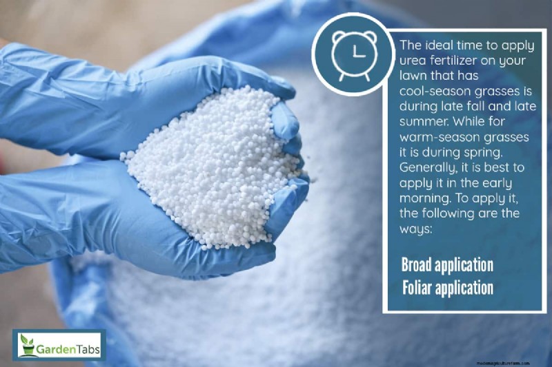 The ideal time to apply urea fertilizer on your lawn with cool-season grasses is during late fall and late summer. While for warm-season grasses, it is during spring. Generally, it is best to apply it in the early morning with temperatures between 32°F and 60°F.