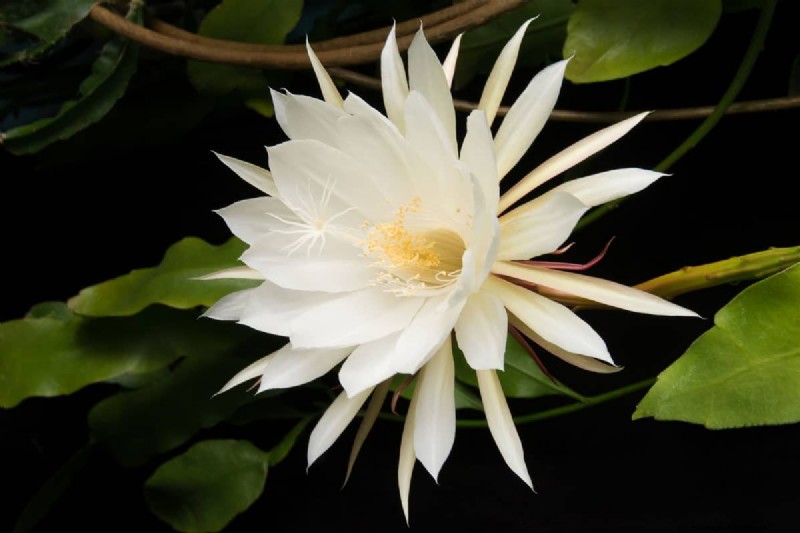 The night-blooming cereus can start to bloom around 9 PM and wither down at dawn. The flower usually has bright white petals with a yellowish or red tinge on the sepals, which are the modified leaves that encapsulates the bud before blooming.