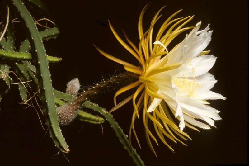 The species of night-blooming cereus called Epiphyllum oxypetalum is a forest cactus that typically clings to tree branches to protect itself from direct sunlight and avoid the water-saturated soil of a rainforest.