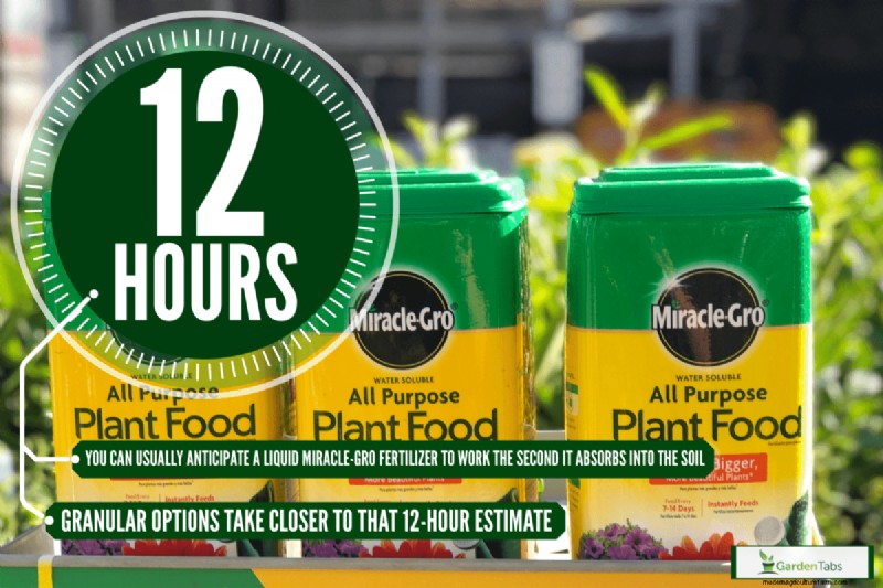 In general, you can expect Miracle-Gro to work in up to 12 hours. According to the brand, you can usually anticipate a liquid Miracle-Gro fertilizer to work the second it absorbs into the soil, while granular options take closer to that 12-hour estimate.
