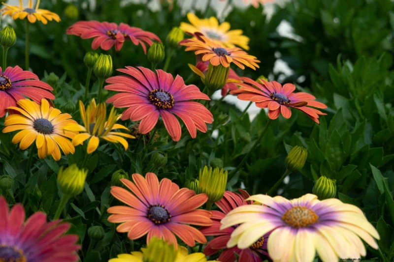 With its origin in South Africa, the African daisy has over 70 species. It comes in various shapes and colors, such as white, purple, blue, red, or yellow, though some petals are multicolored. The petals can appear broad and smooth or spiky and slim.