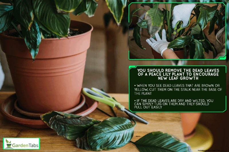 You should remove the dead leaves of a peace lily plant to encourage new leaf growth. When you see dead leaves that are brown or yellow, cut on the stalk near the base of the plant. If the dead leaves are dry and wilted, you can simply tug on them and they should pull out easily.