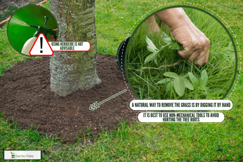A natural way to remove the grass is by digging it by hand. It is best to use non-mechanical tools to avoid hurting the tree roots. Removing the grass using chemical herbicides is also effective but not advisable, because some herbicides could harm the trees.