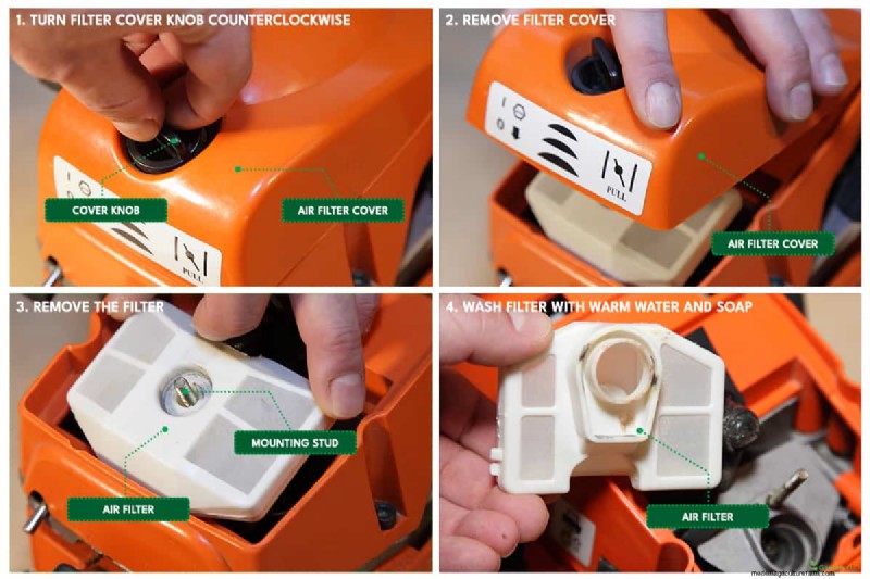 To clean a chainsaw's air filter, first, remove it from the chainsaw. The filter is under a plastic guard held on by a bolt. Remove the bolt to gain access to the air filter.