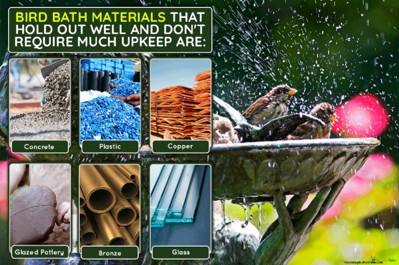 For those wondering what material works best for a bird bath, there are a few we suggest. According to the experts, a few bird bath materials that hold out well and don't require much upkeep are: