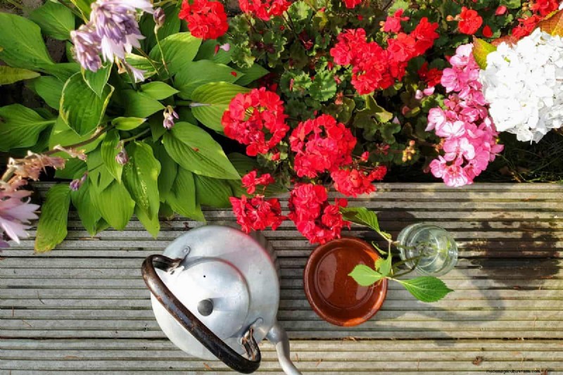 Wear gloves and turn off the stove. Remove the kettle from the stove carefully, and quickly go to where the plants are without wasting any time. Reach the plants before the water cools down.