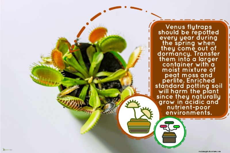 Venus flytraps should be repotted yearly during the spring when they come out of dormancy. Transfer them into a larger container with a moist mixture of peat moss and perlite.