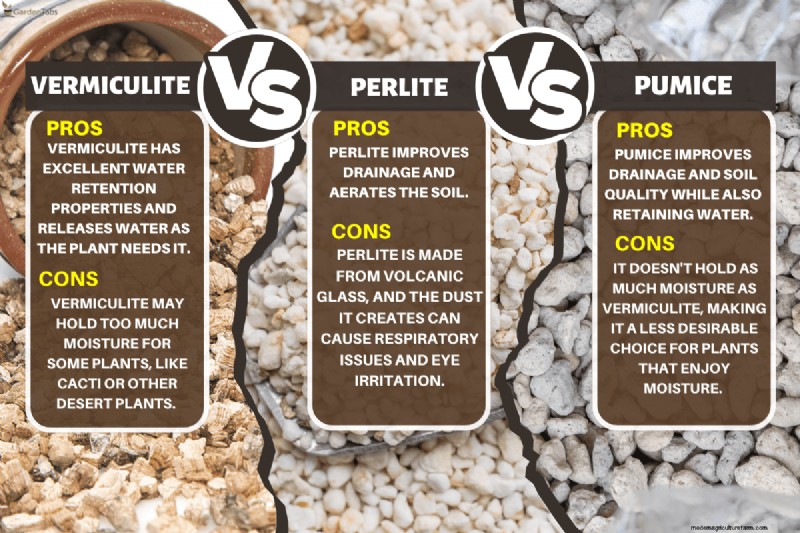 Vermiculite has excellent water retention properties and releases water as the plant needs it. Perlite improves drainage and aerates the soil. Pumice improves drainage and soil quality while also retaining water.