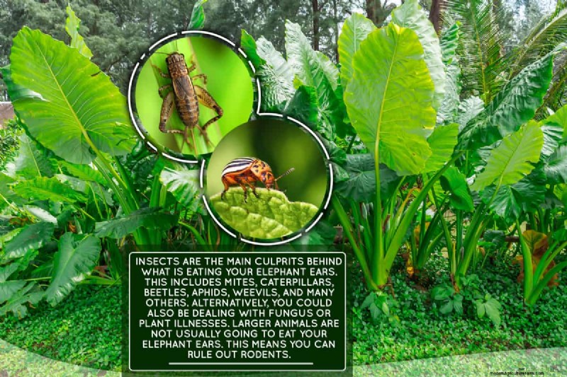 Insects are the main culprits behind what is eating your elephant ears. This includes mites, caterpillars, beetles, aphids, weevils, and many others. Alternatively, you could also be dealing with fungus or plant illnesses. Larger animals are not usually going to eat your Elephant Ears. This means you can rule out rodents.