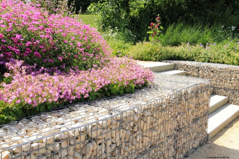 Gabions are metal cages filled with large stones which you can use as a retaining wall edge or as a planter.