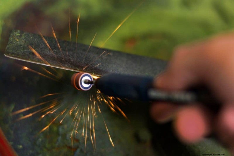First, find a grinding attachment to sharpen a garden hoe with a Dremel. Once you have secured the grinding attachment to your Dremel, secure the garden hoe to a table so you can work on it.