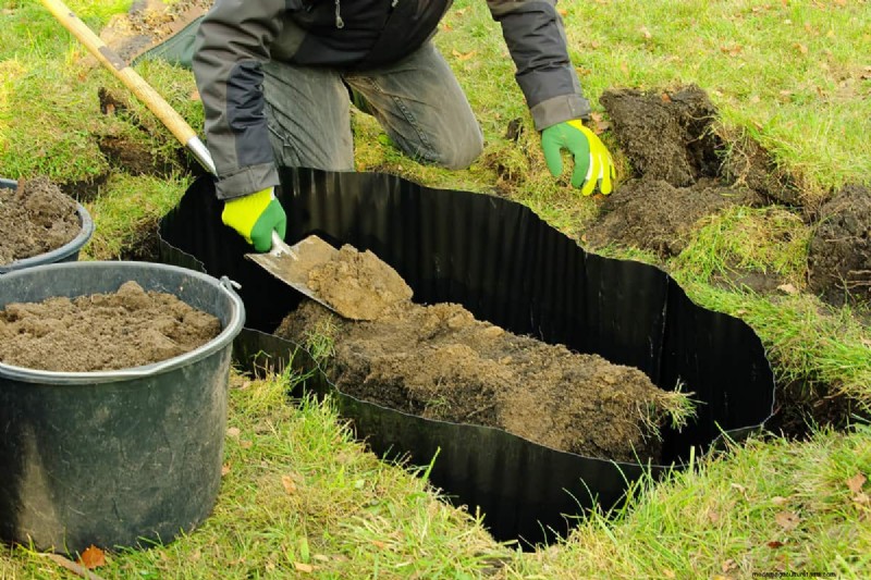 Before digging, lay a tarp or ground cover along the planned path. Put dirt on the tarp as you shovel it. This will make it simpler to fill the trench back up with soil after removing all of it.